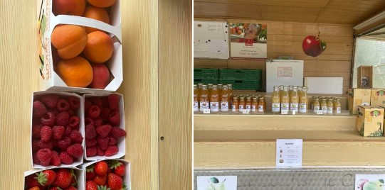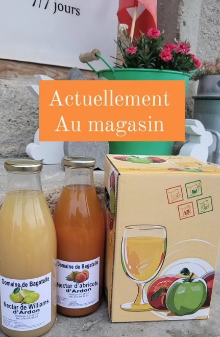 Pommes, poires, pruneaux, framboises et vignes. Jus et nectars. Miel