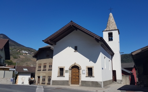 La particularité de cette église est qu'elle se situe à la frontière de deux villages, le choeur et le clocher se trouvent sur Premploz, alors que la nef est sur Erde !